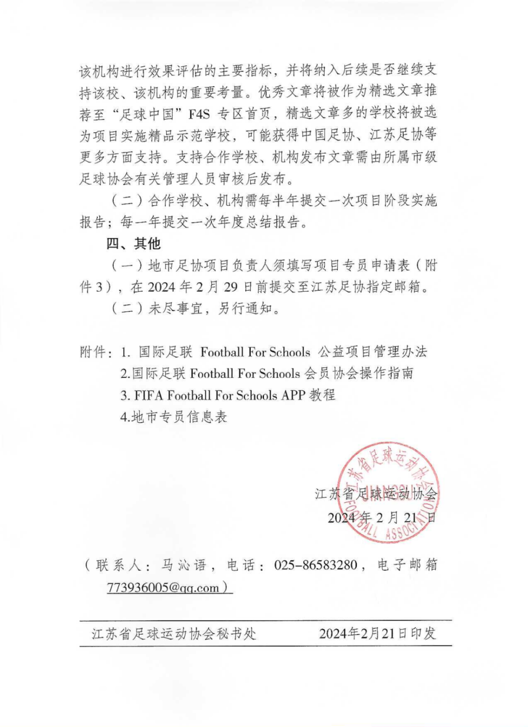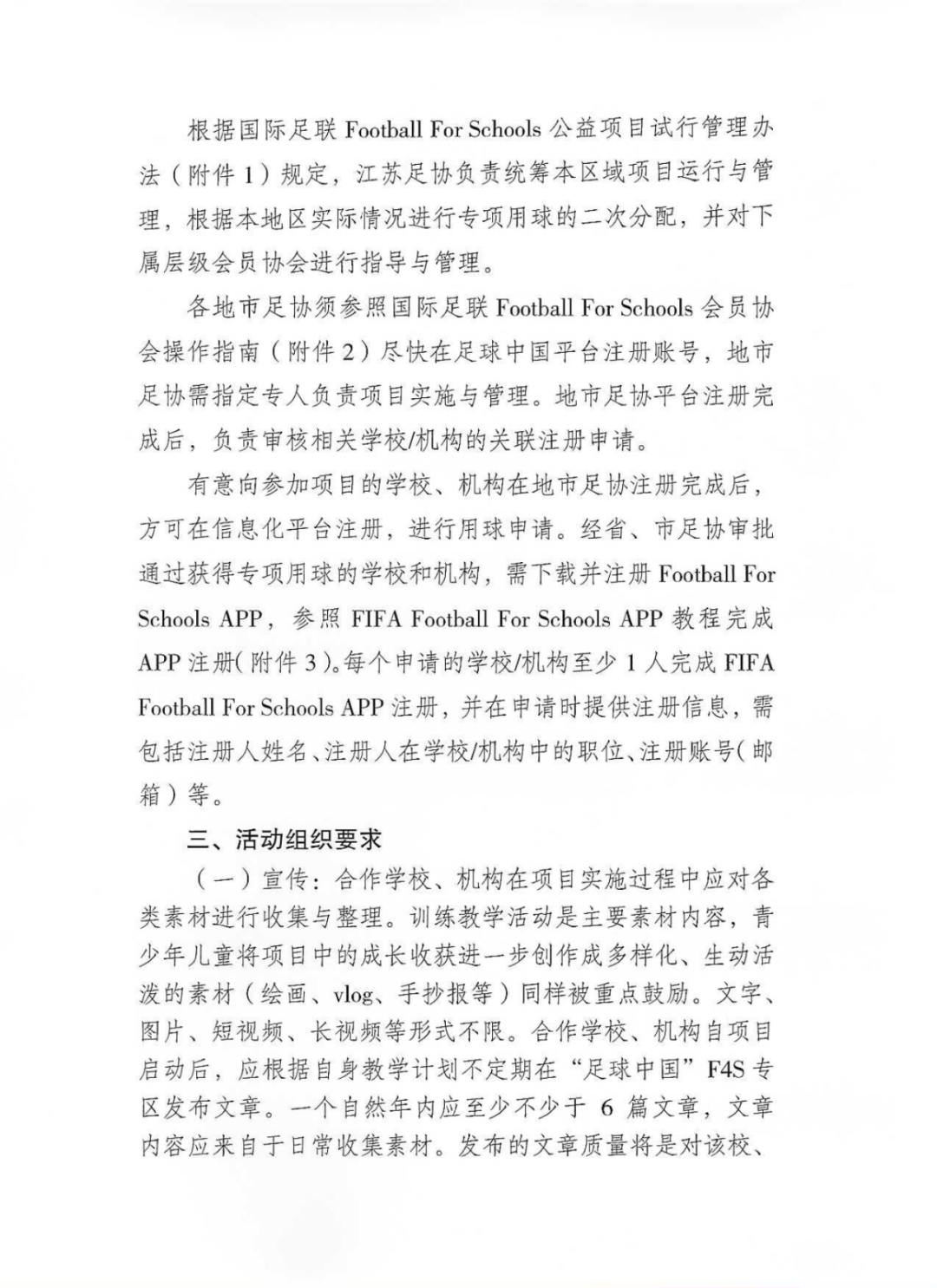 北京时间2月21日,江苏省足球运动协会发布《关于开展国际足联Football for Schools公益项目的通知》。