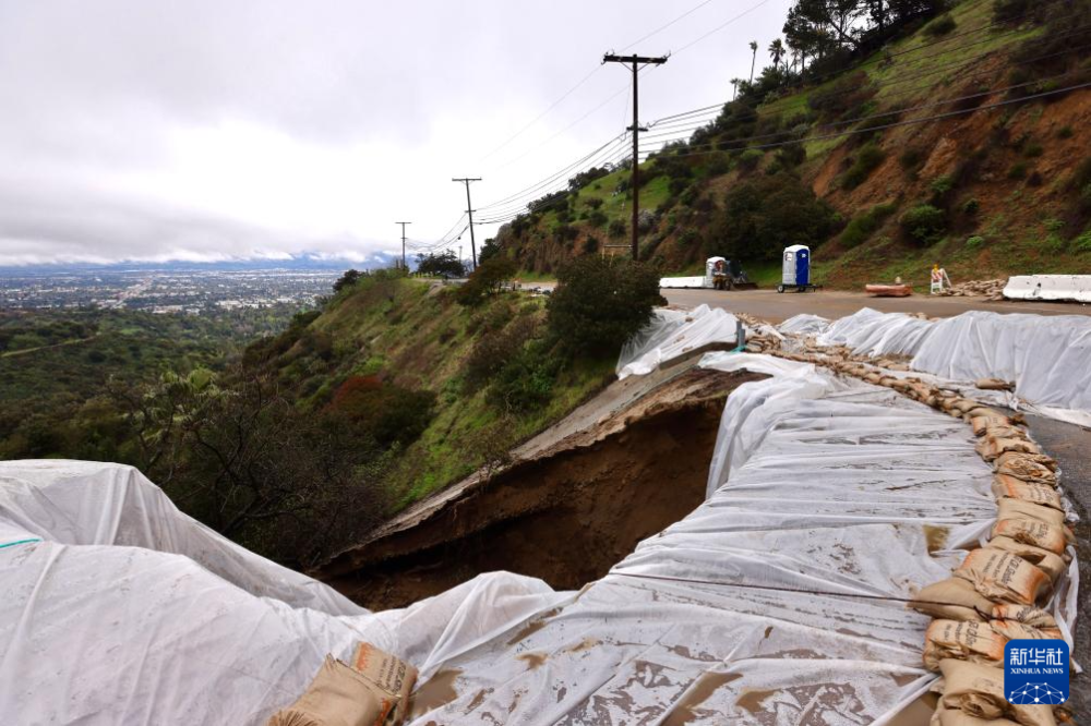 这是2月20日在美国加州洛杉矶拍摄的在泥石流灾害中受损的穆尔霍兰公路。