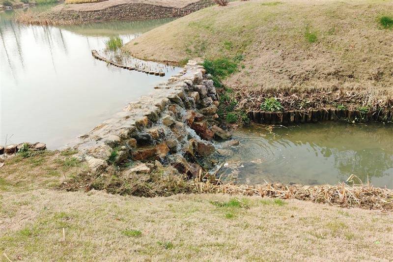 步入这处小型尾水湿地,河岸边的枝头已开始抽芽。两名工人正在清理鸟粪、进行草坪绿植养护。“以前,这是一处小水塘和私垦菜地,还有一些私人养的鸡鸭。”无锡胡埭污水处理有限公司副经理白向兵介绍,胡埭污水处理厂尾水湿地位于污水处理公司内排口到吕舍浜外排口的明渠东侧。项目因地制宜设计生态氧化塘,通过扩大水域面积、增加水生植物、块石跌水增氧曝气、设置自然草坡入水驳岸,不仅提升了区域的生态景观效果,还将污水厂尾水用于区域内生态补水、景观绿化和市政杂用等,真正发挥了湿地净化水质、涵养水源、维护生物多样性等作用。