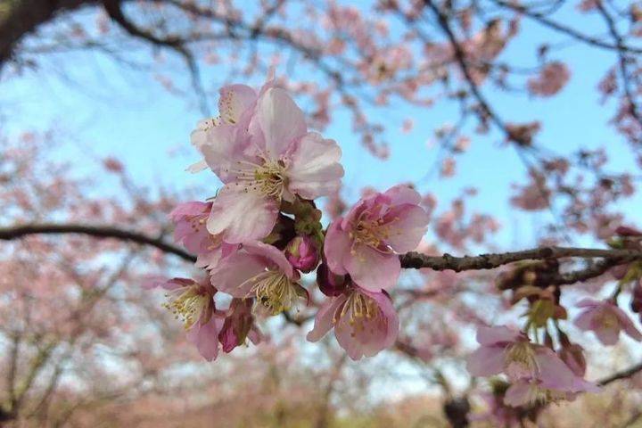 “今年有暖冬效应,所以早樱第一株‘风向标’在春节期间就已经早早开放了。现在景区的花已经开放了二成左右,主要绽放的品种是观赏性很强的河津樱。”