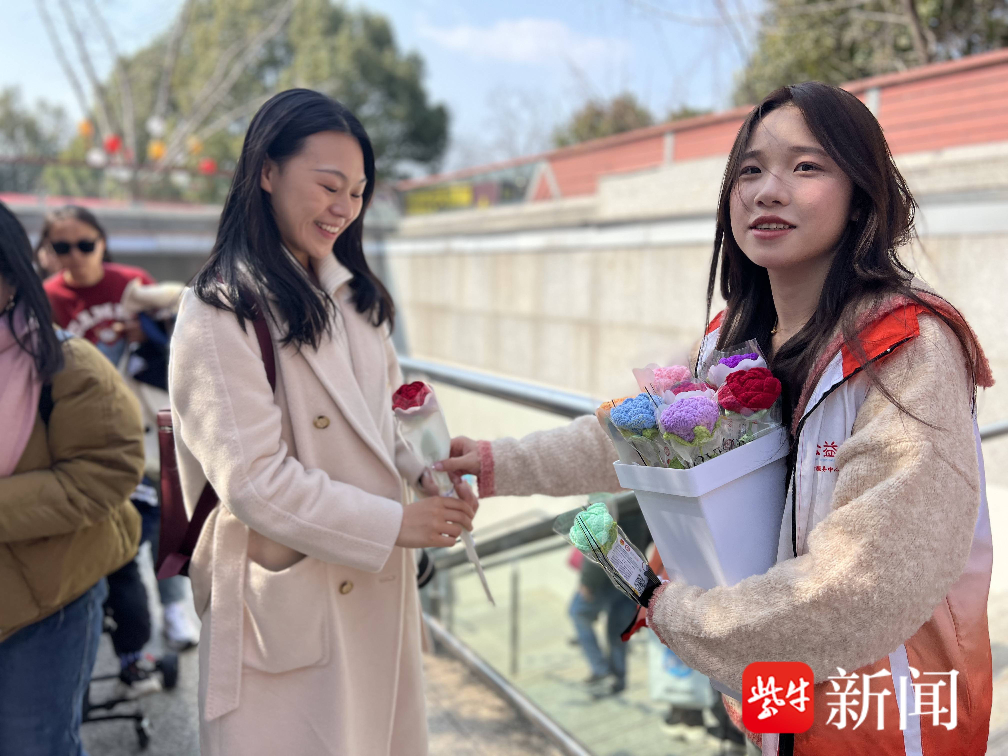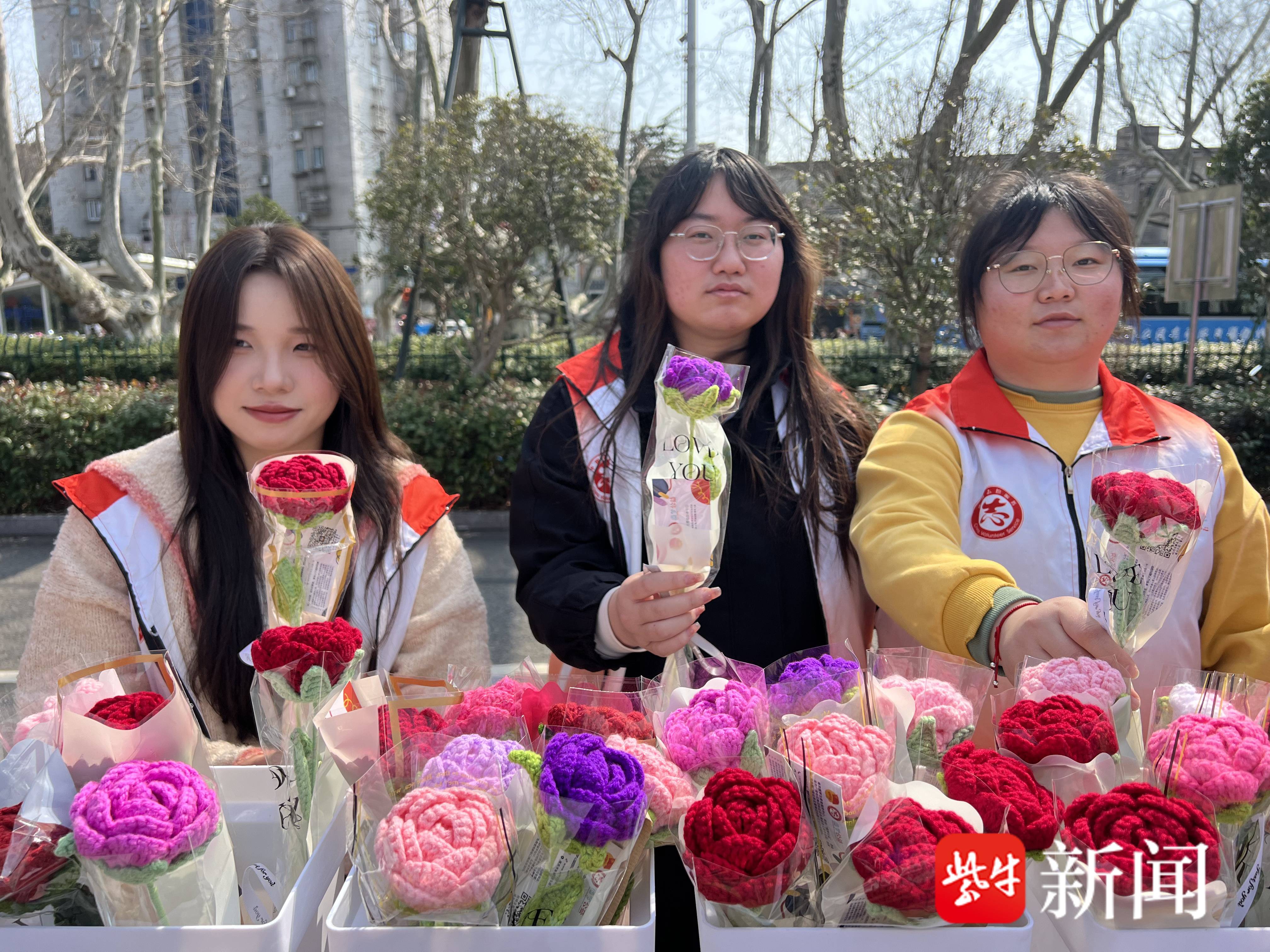 下午1时许,在南京地铁二号线苜蓿园站的一号出入口,几位来自南京钟山职业技术学院现代家政服务与管理专业大一的学生季同学、孙同学正在热情地向过往乘客介绍她们手中用彩色毛线手工制作的“毛线鲜花”。