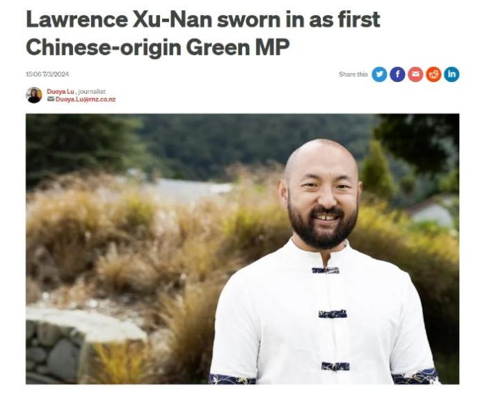 中新网北京3月8日电 近日,徐南(Lawrence Xu-Nan,音译)宣誓就任新西兰绿党议员,成为该党在国会中的首位华人议员。他表示,他的到来将大大增强党团的多样性。