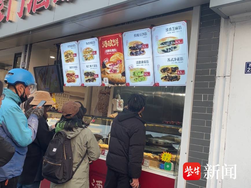 “老板,牛肉的和招牌玫瑰各来5个。”“我想要每个口味来一个,都尝尝鲜。”记者来到位于北寺塔附近的一家酒酿饼店,门口排起了长队,顾客们抬头张望着刚出锅的酒酿饼,迫不及待地想买上一份,品尝专属苏州的春日美味。抬眼望去,菜单上共有8种口味可以选择,除了传统玫瑰、豆沙、芝麻和薄荷口味,店里推出了牛肉、海苔肉松、松仁梅菜等创新口味。