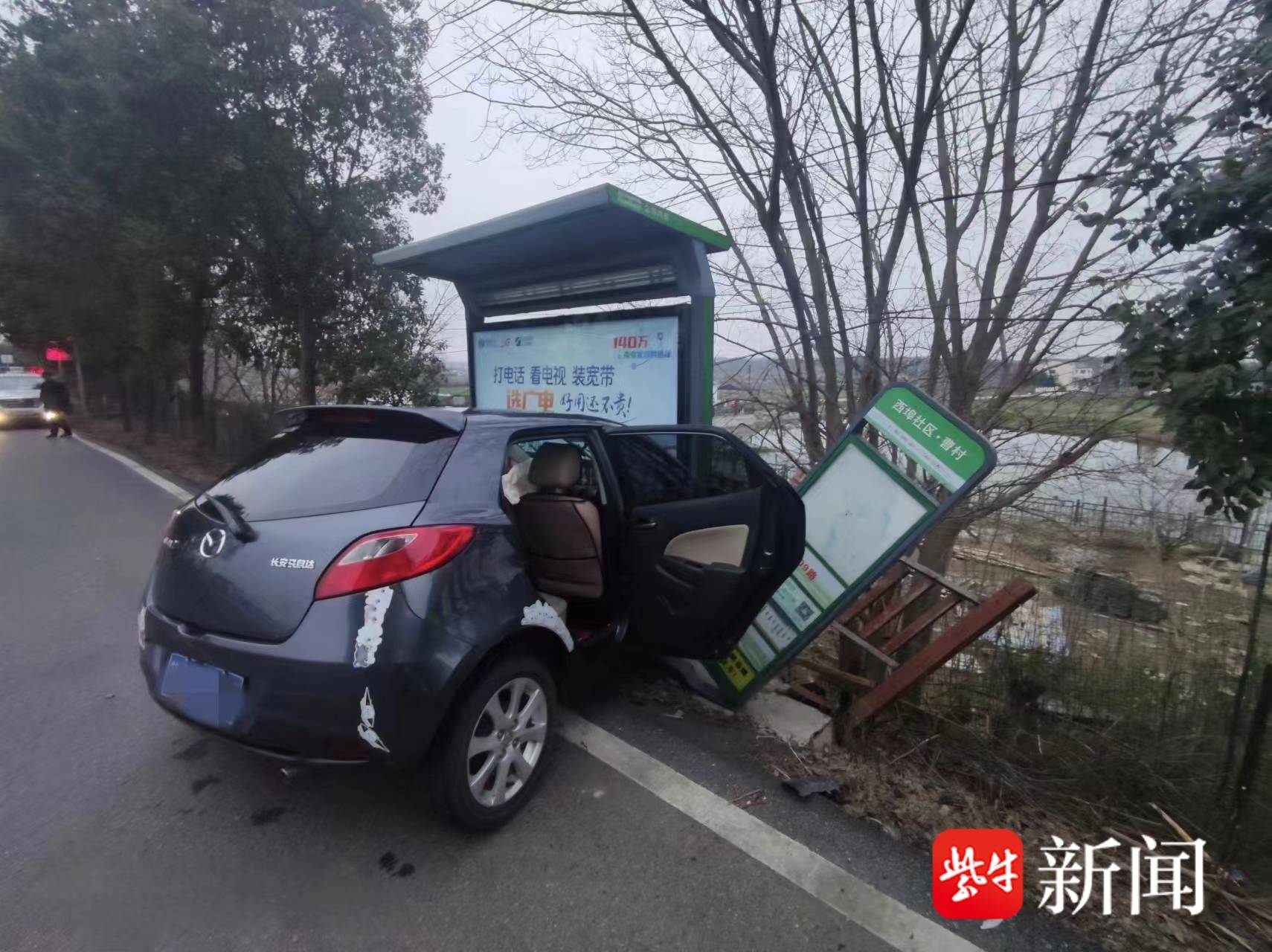 图为小轿车撞上公交站台