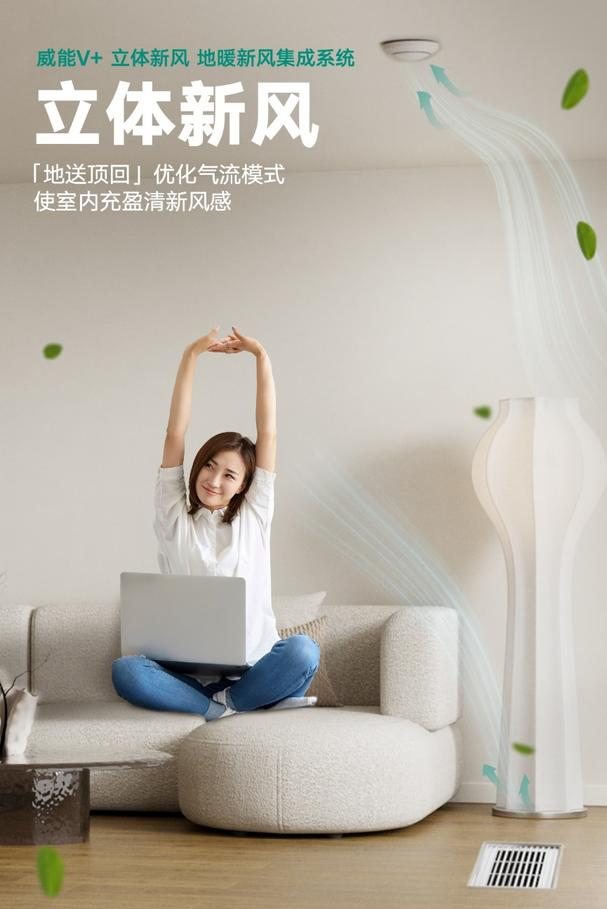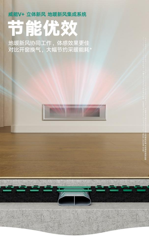 威能V+立体新风地暖新风集成系统,采用“地送—顶回”气流优化模式,室内空气自下而上形成全空间环绕式循环流动,这种设计能让消费者在家中感受到全方位的新风充盈身边,足不出户,即可畅享自然的呼吸和纯净。