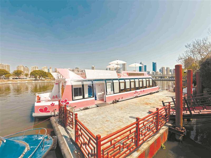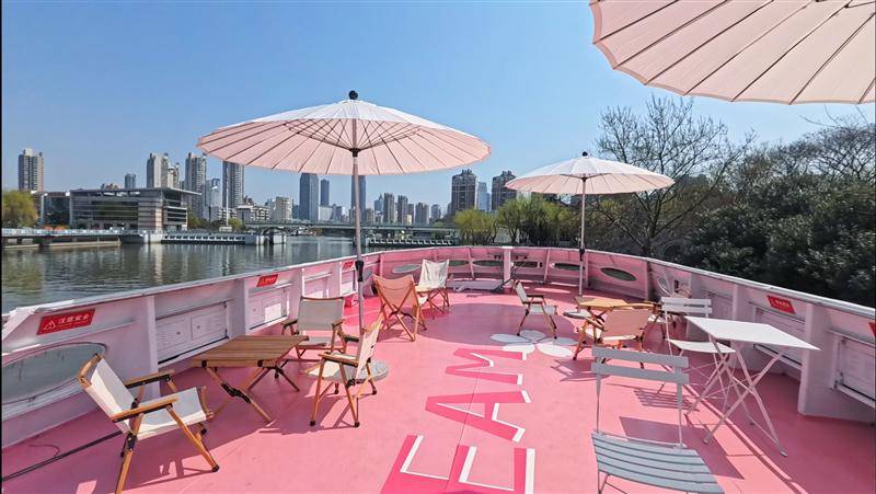 这条精心设计的游线不仅能让游客们领略到大好自然风光,也能深度体验城市历史文化。梁韵苑、仙蠡墩、蠡溪苑、渔趣园、梁湖生态园等开放式景点星罗棋布,仿佛一幅幅生动的历史画卷在眼前徐徐展开。据介绍,今年的游船迎来全面升级。樱花咖啡主题游船以粉色船身亮相,船内装饰文艺气息十足,让人仿佛置身于梦幻的樱花世界之中。“游船内部也提档升级,设置了樱花主题的咖啡、甜点。”