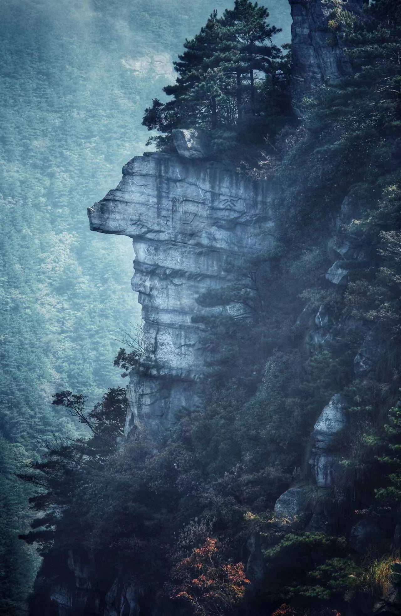 从狮子口行至好运石,升腾的云气渐起相接,须臾遍满上下,茫茫不辨海陆。手脚并用登上浑然天成的断崖,俯瞰脚下苍云作海,翻滚腾挪。转瞬之间,铺海之云复又忽焉迸散,宛如凫惊兔逝。风流云散之后,灿若图绣的山谷露出了五色分披的本色。蓦然回首,绝壁断崖上巨大的山石人面像映入眼中,竟是如此惟妙惟肖。
