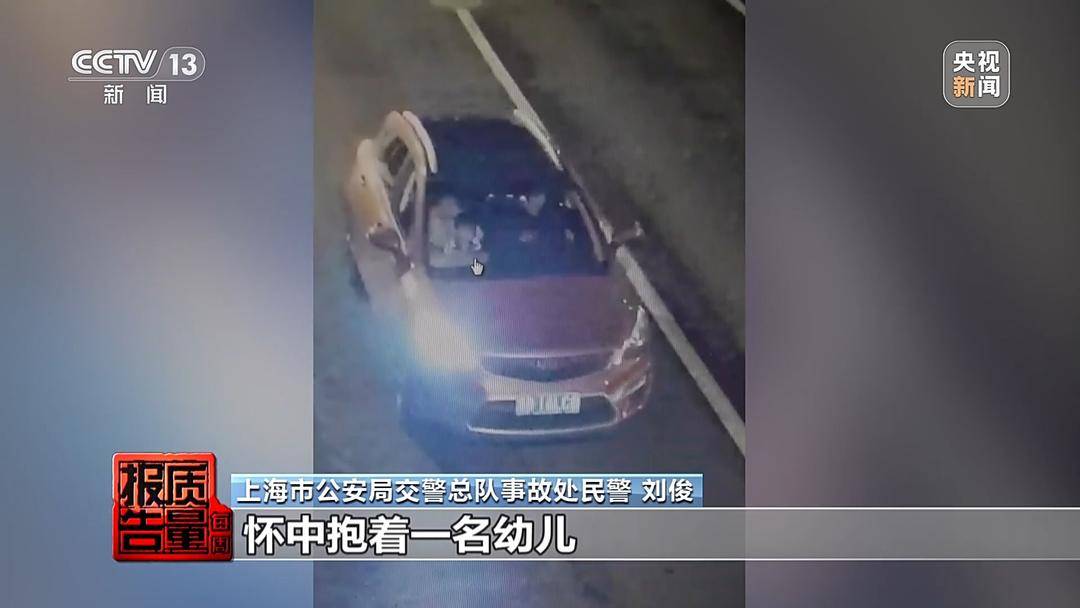 上海市公安局交警总队事故处民警 刘俊:我们可以看到车内副驾驶乘坐一名成年人,怀中抱着一名幼儿,随后在与一辆变道车辆发生碰撞后发生侧翻。车内副驾驶的儿童被甩出车外以后,倒在机动车道里面。