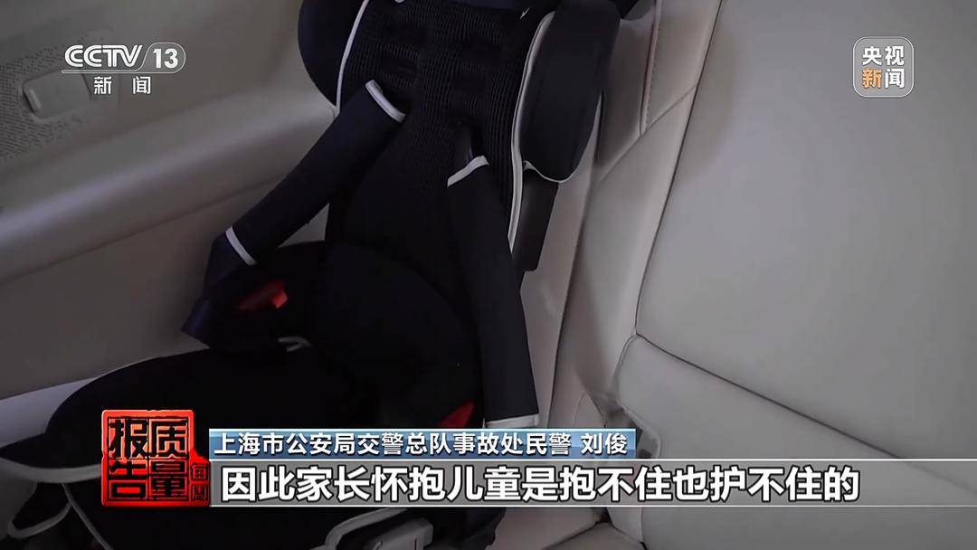 上海市公安局交警总队事故处民警 刘俊:其实在车速50公里的时候,一位12公斤左右重的儿童就能产生上百公斤重的冲击力,因此家长怀抱儿童是抱不住也护不住的。