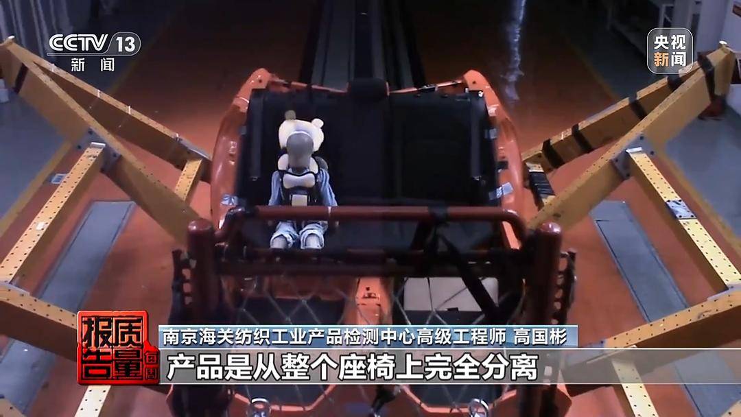 南京海关纺织工业产品检测中心高级工程师 高国彬:通过这个视频我们可以清楚地看到,连接这个汽车座椅跟靠背的这一个织带,乃至它的一个扣具是完全断裂。合格的儿童安全座椅,在进行这样的一个正向的50公里碰撞的时候,不论是它的连接件,还是就是它的扣具织带,都不可以出现断裂。