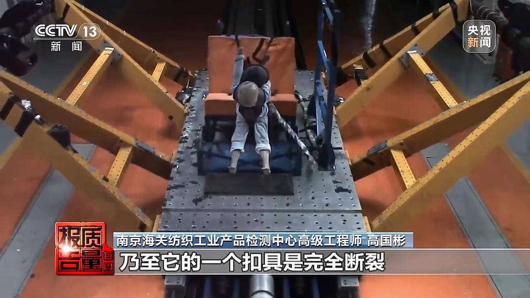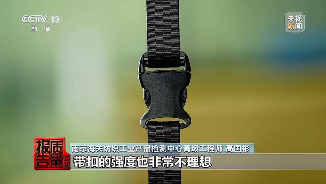 南京海关纺织工业产品检测中心高级工程师 高国彬:测试结果非常不理想,织带强度只有700牛顿左右,国家标准要求是不低于7200牛顿,这一次的测试,织带的强度远远低于国家的标准,带扣的强度也非常不理想,测试强度只有400牛顿,远远低于国家标准规定的10000牛顿。