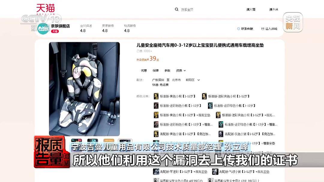 宁波吉曼儿童用品有限公司技术质量部经理 孙立峰:统计了一下,查到了有26家天猫店使用了我们的证书,盗用了我们的证书,产品完全不是我们的产品。有点很明目张胆在用,我们根本也拿它没辙。