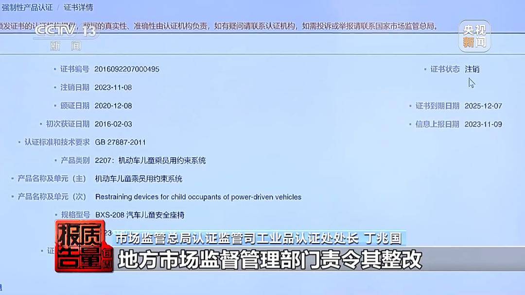 市场监管总局认证监管司工业品认证处处长 丁兆国:企业必须依据强制性标准实施组织生产,通过认证机构对产品实施认证加贴CCC标志。从2015年9月1日起未获得CCC认证的儿童安全座椅不得出厂、销售、进口或者在其他经营活动中使用。