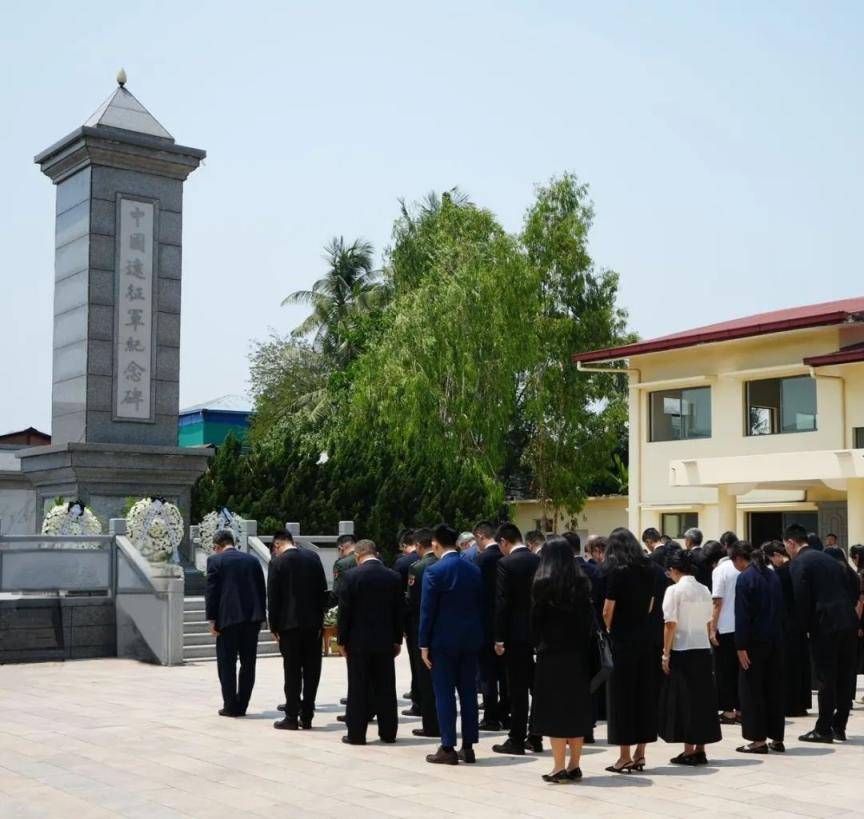东吁是二战期间中国远征军抗击日本法西斯的会战史迹地。陈海大使等向远征军纪念碑敬献花篮。全体人员默哀追思。