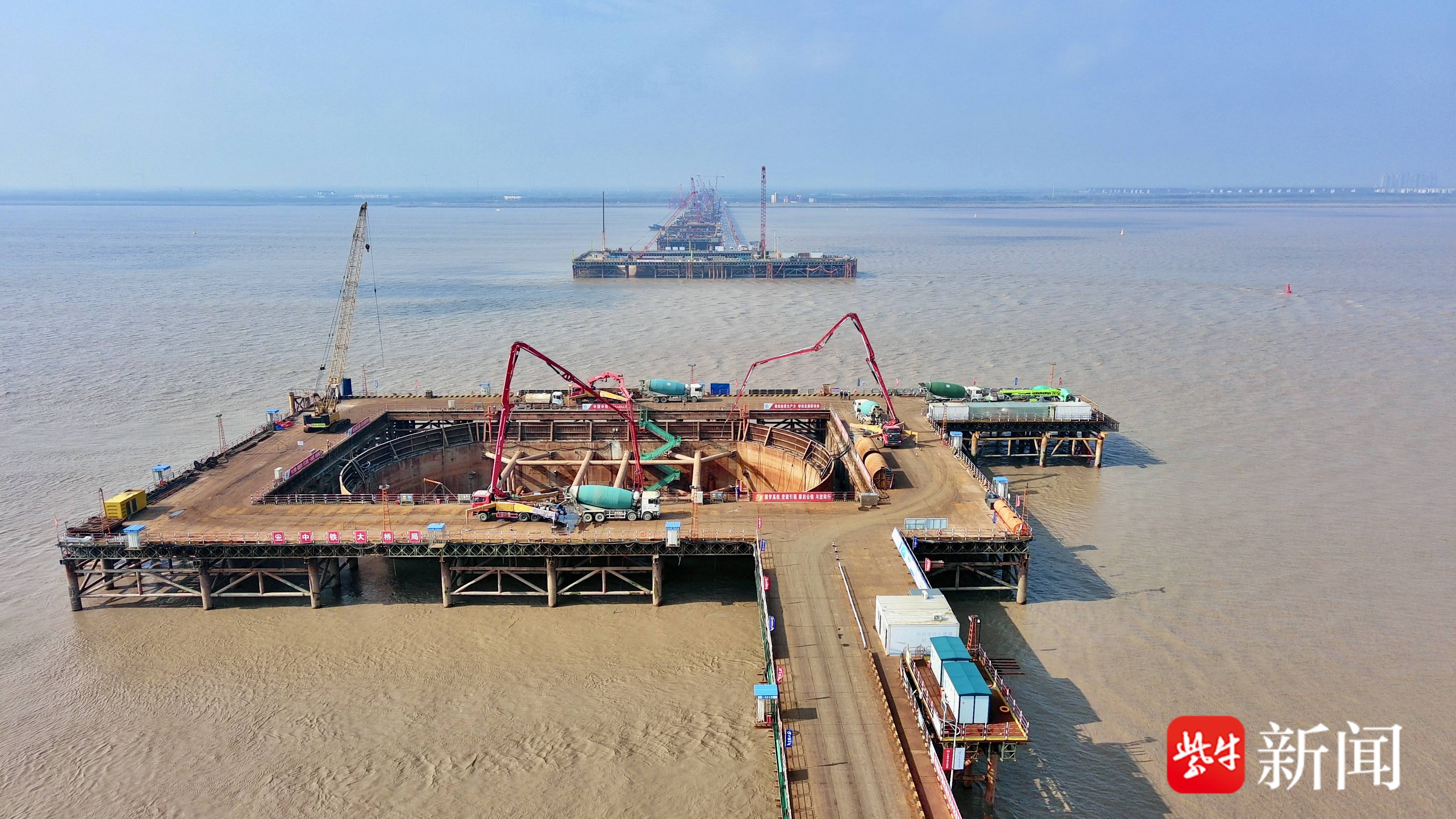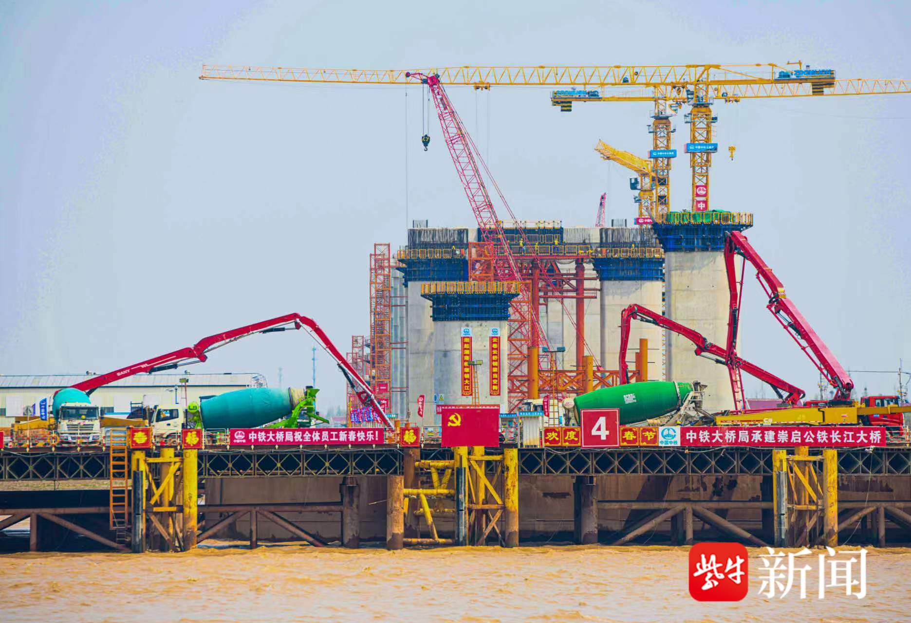“春耕”模式下,崇启公铁长江大桥主通航孔桥钻孔桩全部完成,南引桥承台完成33%,墩身完成20%,北引桥承台完成100%,墩身完成50%。预计4月底,主桥两主墩承台全部浇筑完成,将进行塔座及主塔施工阶段,今年底,崇启公铁长江大桥塔身增长到103米,南北合建段引桥同步推进中。