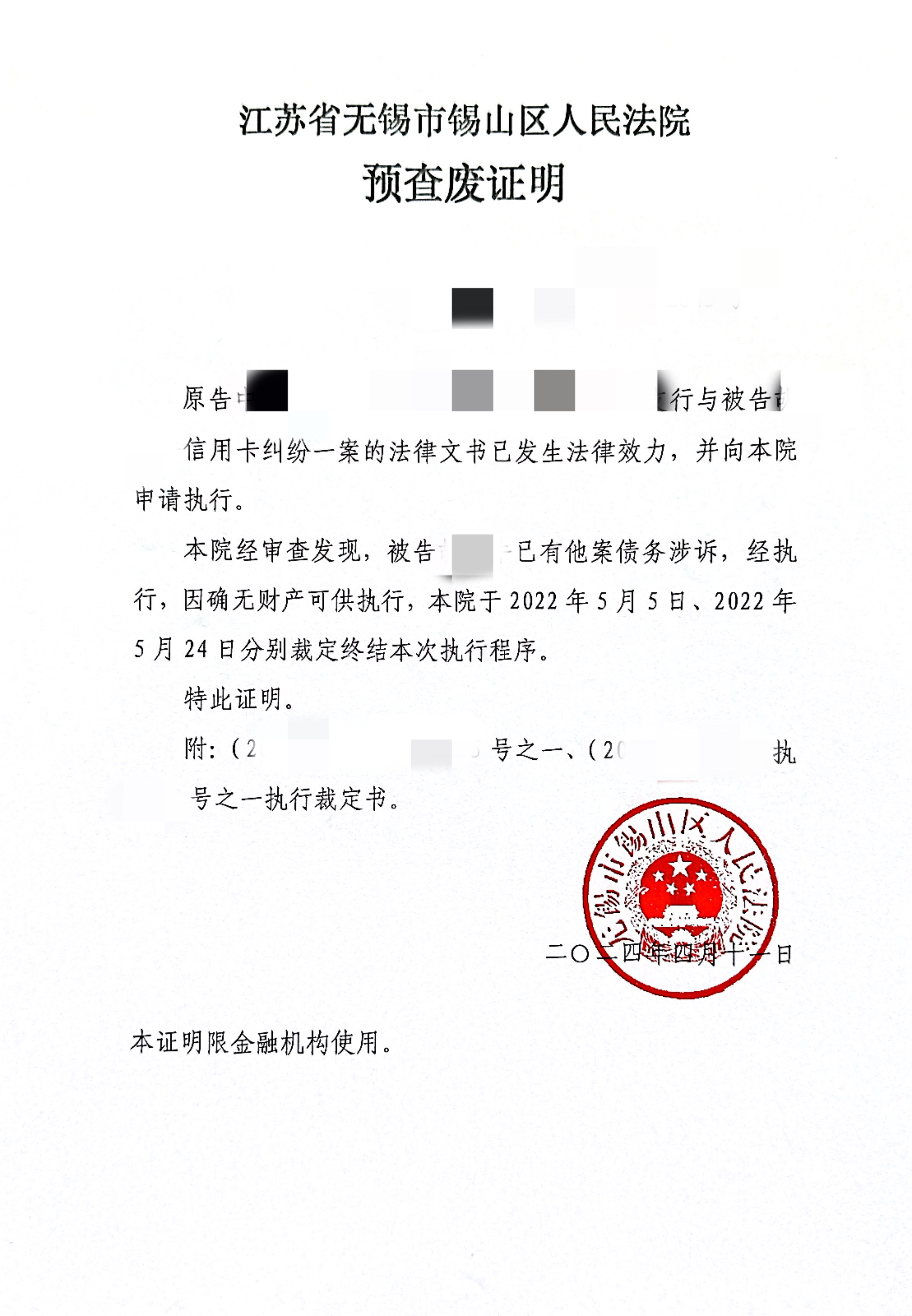 为解决这一问题,针对小额金融贷款及信用卡案件,4月12日,锡山法院试行向银行发出《预查废证明》,载明:本院经审查发现,被告已有他案债务涉诉,经执行,因确无财产可供执行,本院已裁定终结本次执行程序,同时备注本证明限金融机构使用。