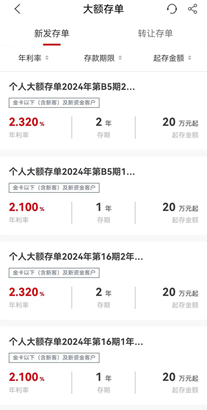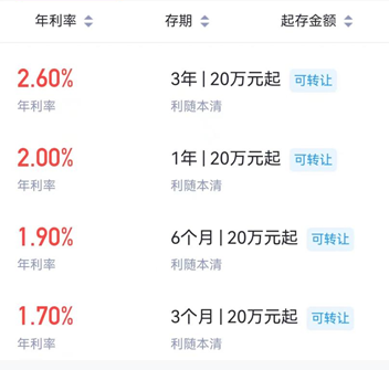 在另一家股份制银行的线上,记者查到,仍有期限为3年的个人大额存单产品,产品起点为20万元,年利率2.60%。