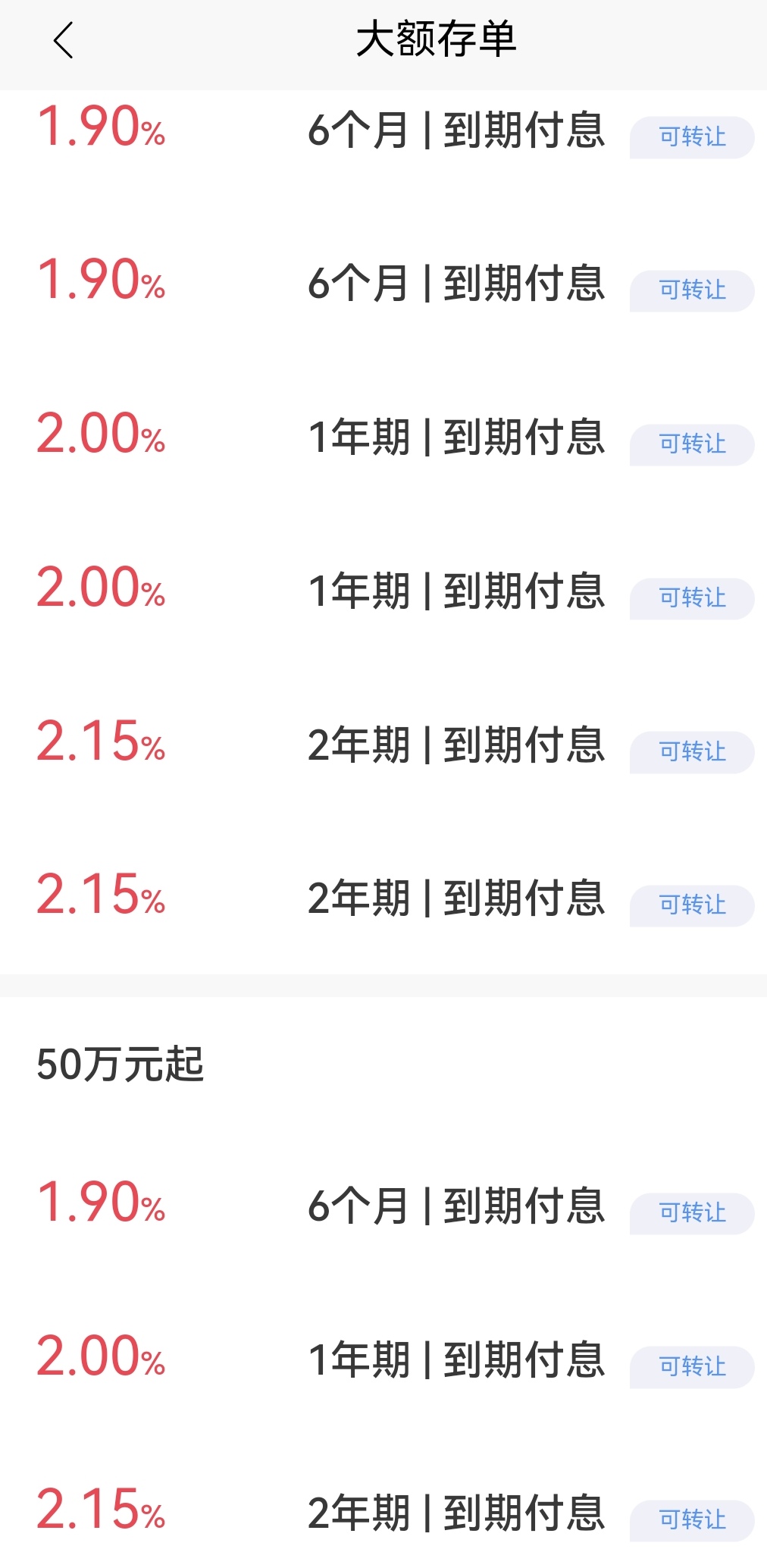 在一家股份制银行的APP上,扬子晚报/紫牛新闻记者发现,该行目前已经没有3年期、5年期的大额存单。仅有2年期以内的大额存单,其中,20万元起对应的2年期大额存单的年利率为2.15%,1年期的年利率为2%,6个月、3个月、1个月的年利率分别为1.9%、1.7%和1.65%。50万元起的大额存单期限仅有2年期、1年期和6个月的选择,对应的年利率是2.15%、2%和1.9%。这三个档次与同期限20万元起的大额存单的利率一样。换言之,50万元也并没有因资金量比20万元大而获得更高收益。不过,对应该行同期限的定期存款年利率1.65%,大额存单还是有优势的。