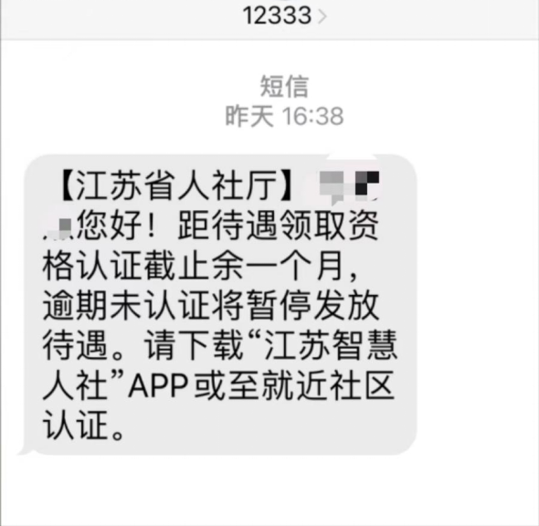 “***,您好!距待遇领取资格认证截止余一个月,逾期未认证将暂停发放待遇。请下载‘江苏智慧人社’APP或至就近社区认证。”