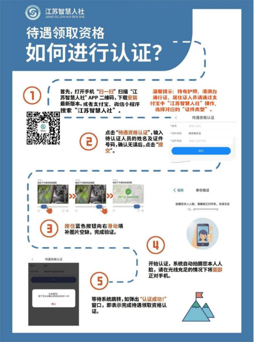 如果是接收到前述短信,则短信接收人需要尽快完成养老待遇领取资格认证,认证方式有两种:到就近社区进行认证,或者在小程序自助认证。其中,小程序自助认证的具体步骤是:打开微信、支付宝等APP,搜索小程序——“江苏智慧人社”(无需注册),首页点击“待遇资格认证”,对着手机屏幕配合提示,做几个简单动作即可完成“刷脸认证”。
