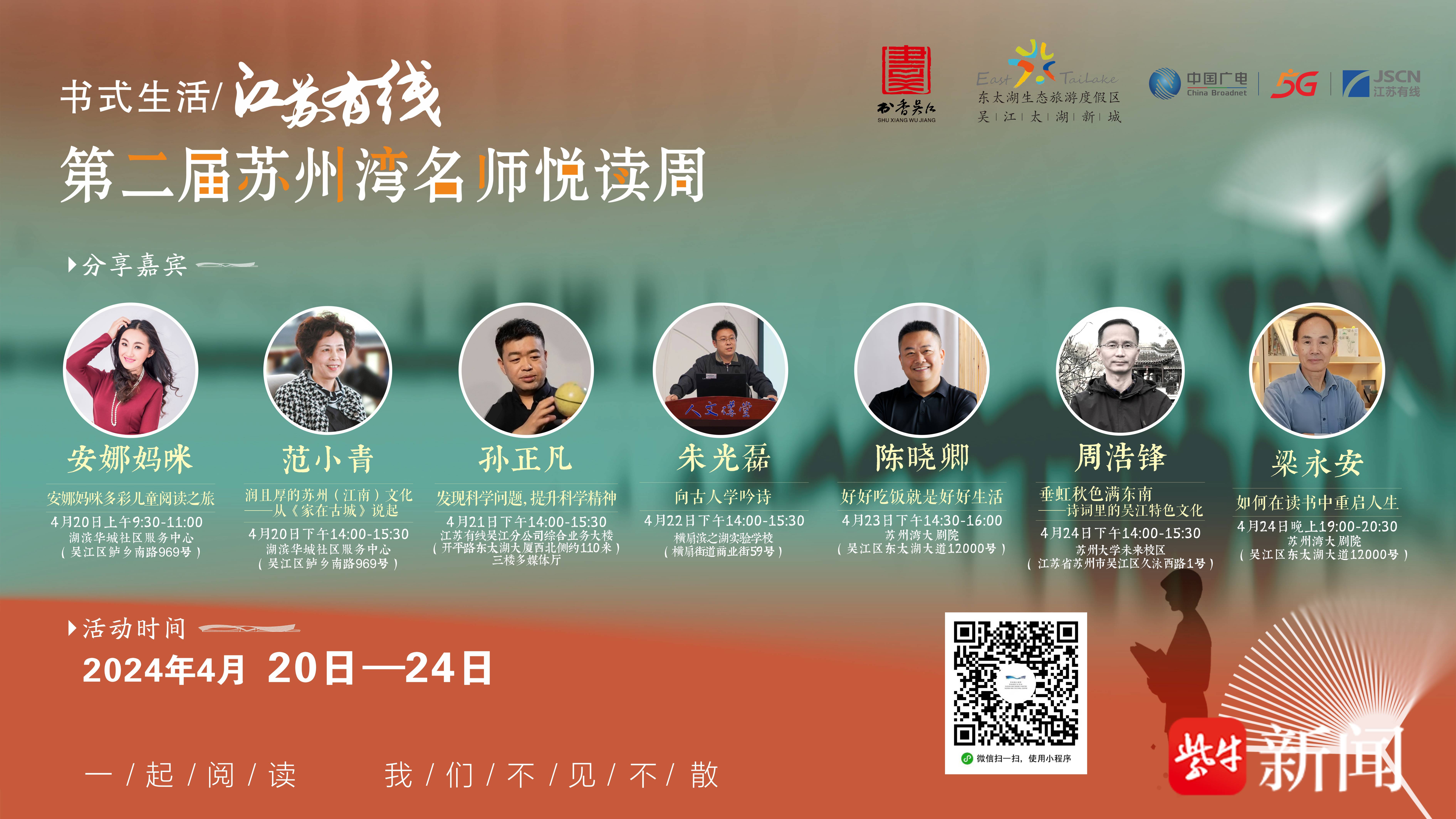 另外,江苏有线第二届苏州湾名师悦读周已于4月20日正式启动,即日起至4月24日期间,东太湖度假区将邀请名师悦读面对面,大咖云集,倾力呈现。邀您一起来东太湖“阅”个会吧!