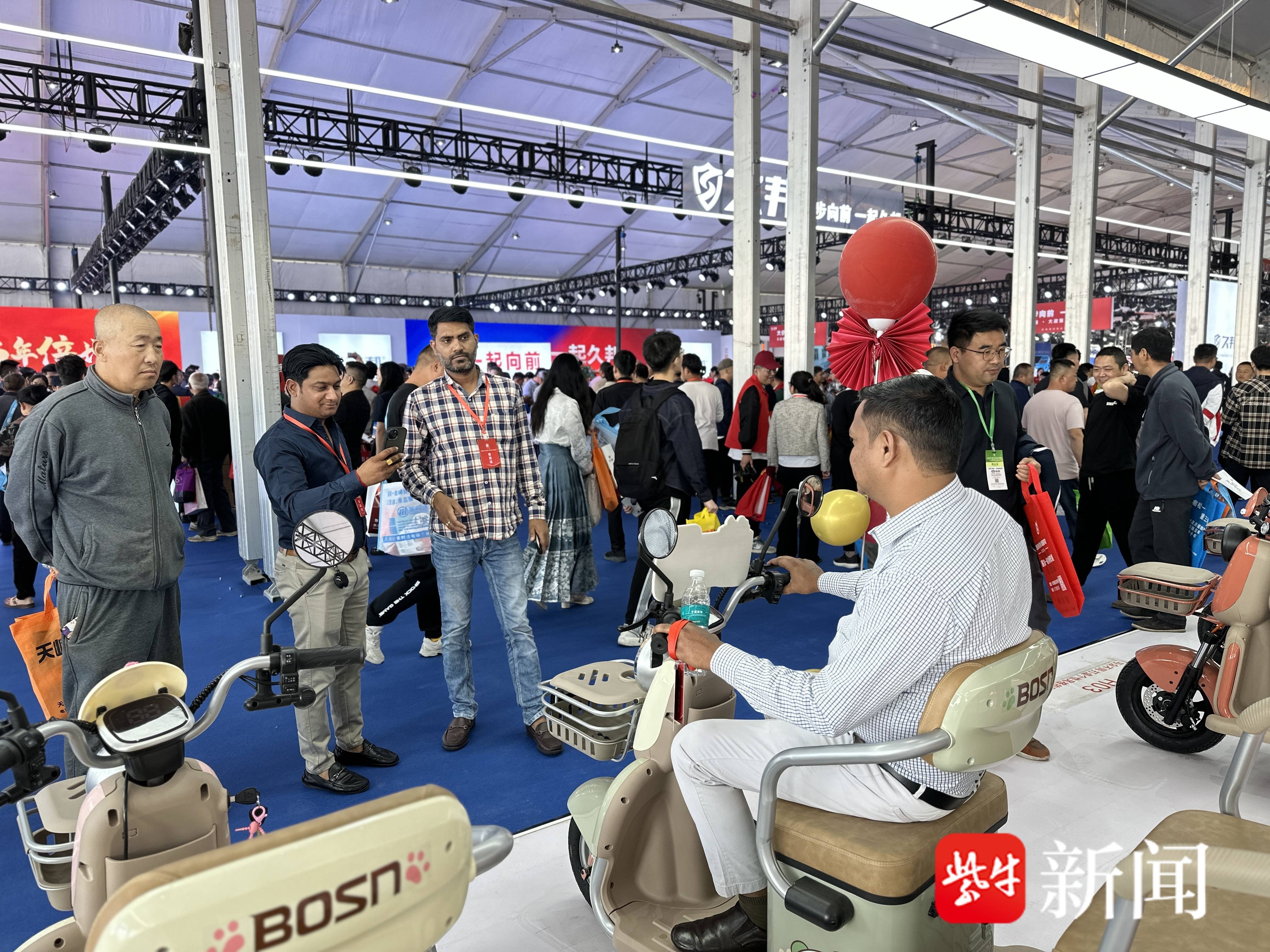 在车展现场,来自山东济宁的金博篷车带来的客货两用电动三轮车吸引了大批国外客商关注。据销售部长杨勇介绍,本次是金博蓬车第一次参加丰县电动车展,共带来了20余款车型进行现场展览。“本次车展规模大、人流量高,希望能通过这次车展向更多人展示我们中国电动车行业的高速发展,让中国的电动车走向全世界。”