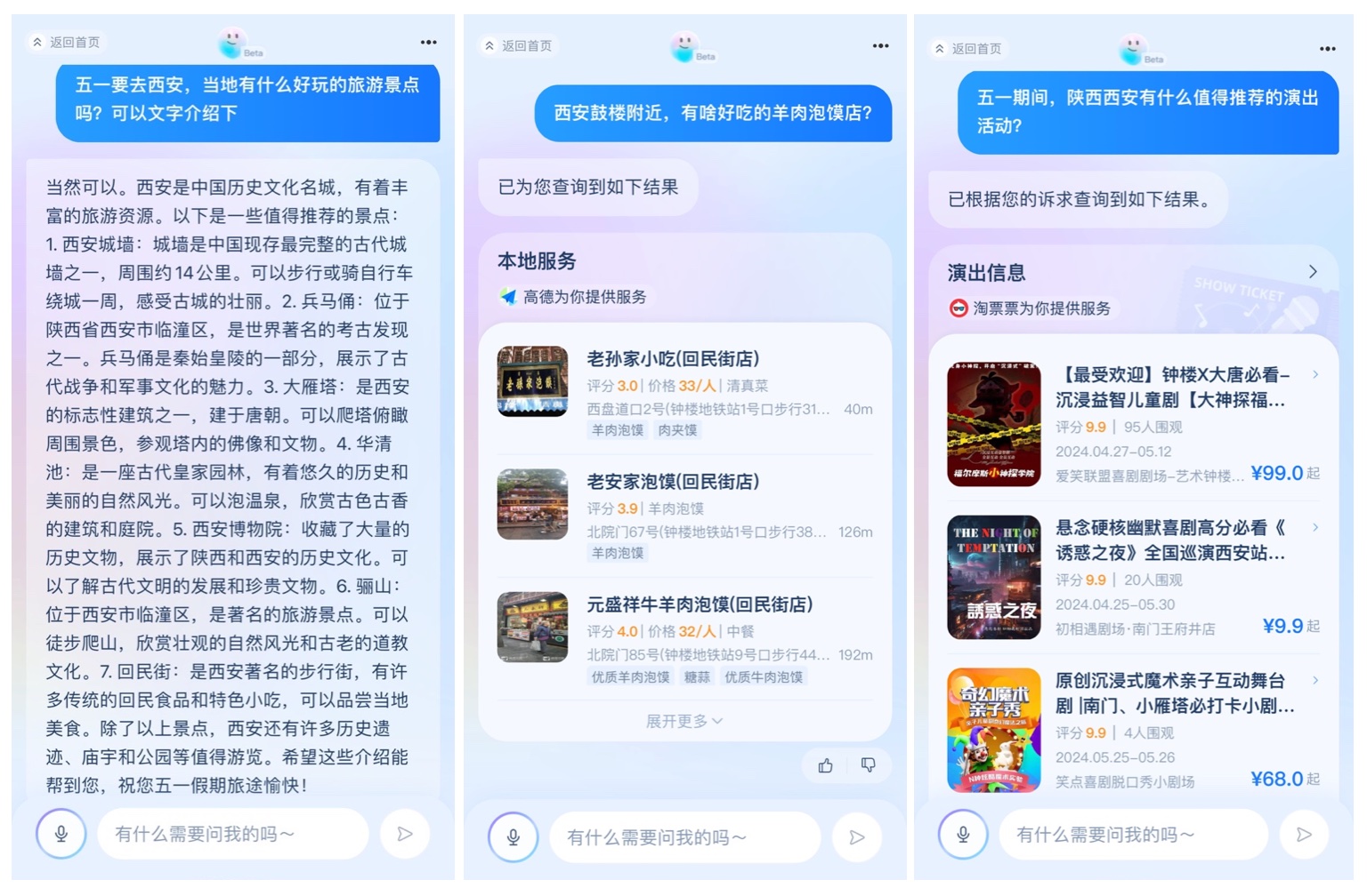 针对出行目的地,这个AI办事助手除了推荐旅游景点外,也能搜寻当地的餐饮美食、演出活动、电影院、露营地等。