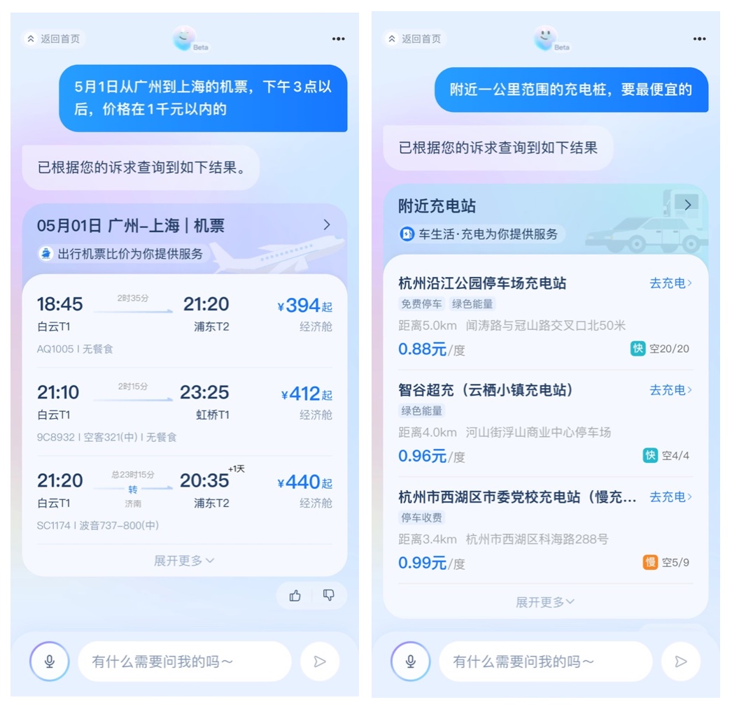 比如五一假期要来了,用户可以用文字或语音简单输入一句话,就能根据时间、价格等指定需求,5秒内快速找到相应的车票或飞机票;自驾游的车主,也能根据你的实时位置,精准查询距离最近、价格最优惠的充电桩和加油站。