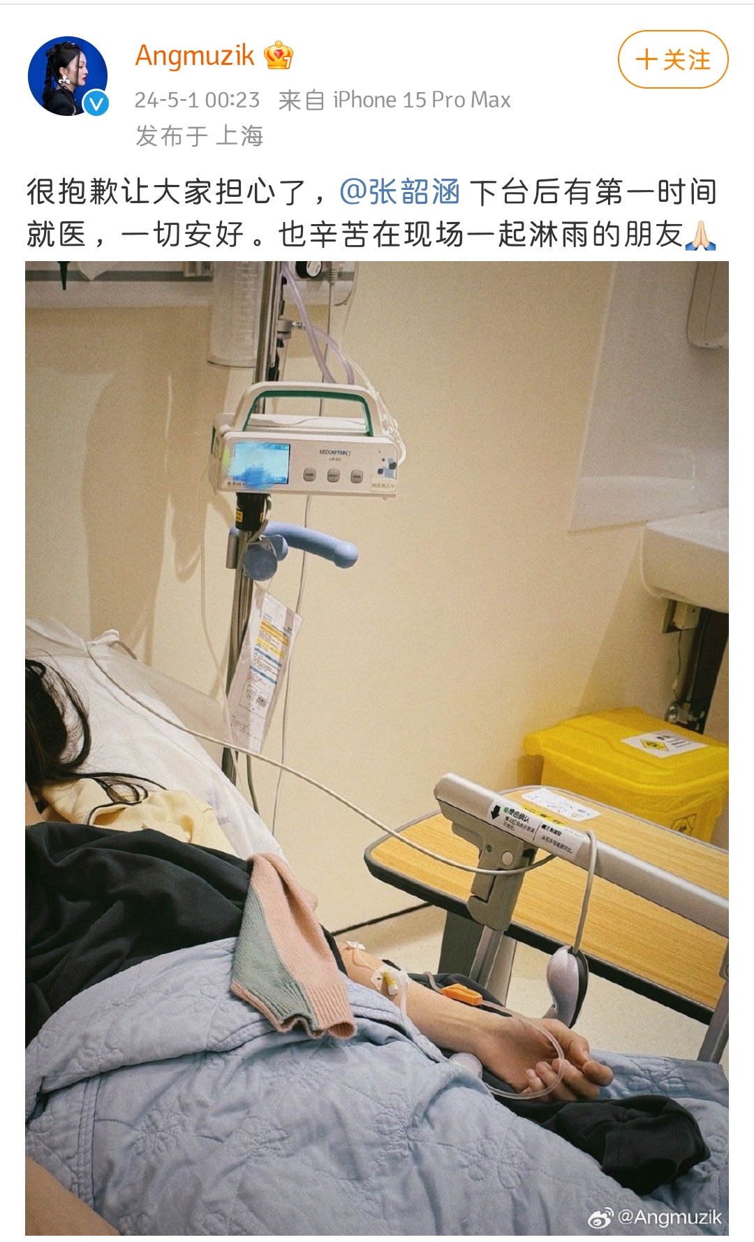 5月1日凌晨,时光classic官方微博曾发布过致歉信,但现已删除。1日凌晨,张韶涵经纪公司发文向粉丝们报平安,表示张韶涵在下台后第一时间就医了,并配了她躺在病床上输液的照片。昆山12345则回应确实接到了来电反馈这件事,相关部门正在处理。