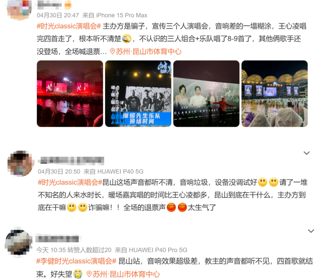 4月30日晚,时光classic演唱会昆山站举行了演出,5月1日,“昆山演唱会退票”的词条登上微博热搜,多位现场观众上传了演唱会当晚场内呼喊“退票”的视频。