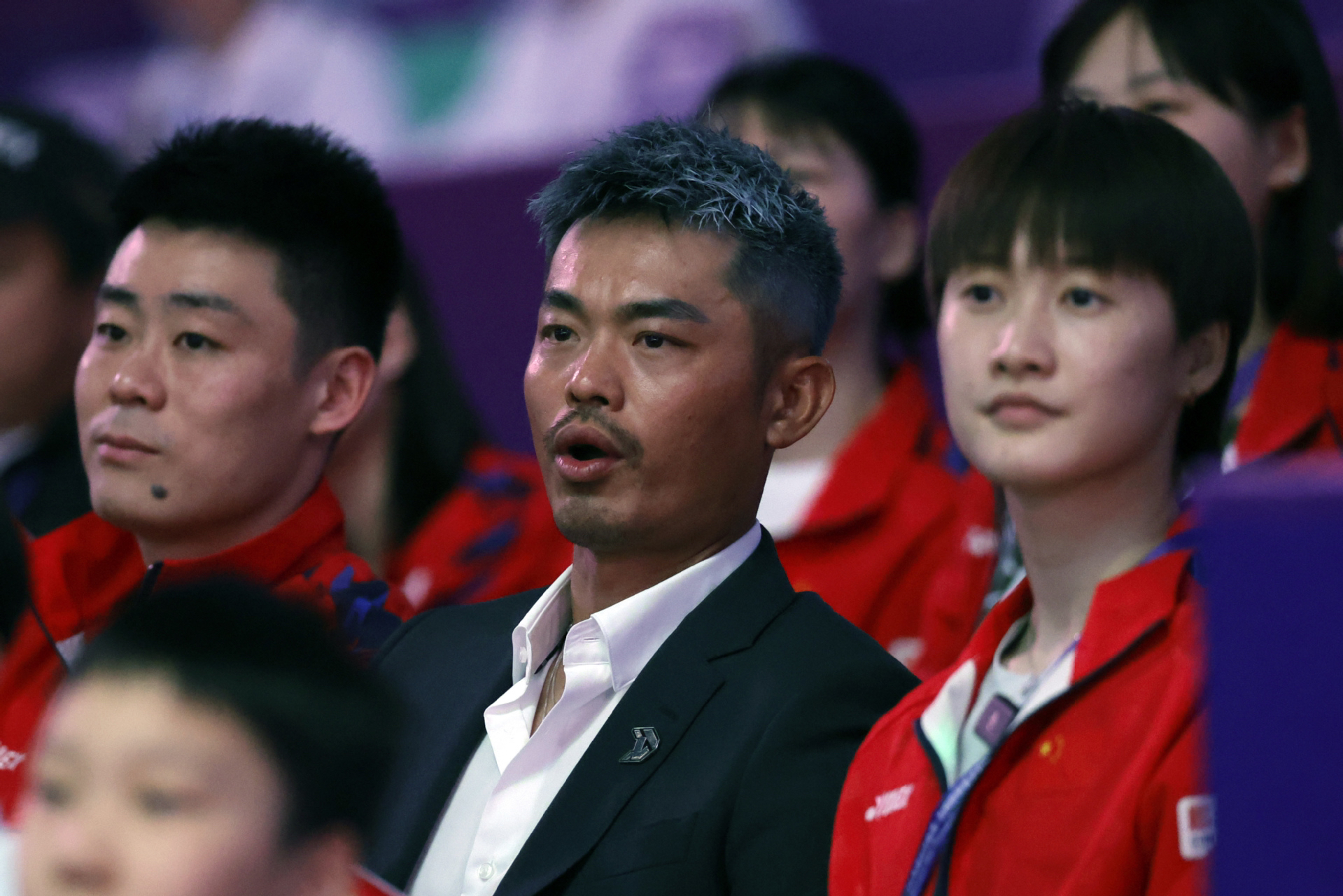 林丹(中)在场边观看中国队选手石宇奇与印度尼西亚队选手金廷的男子单打比赛。
