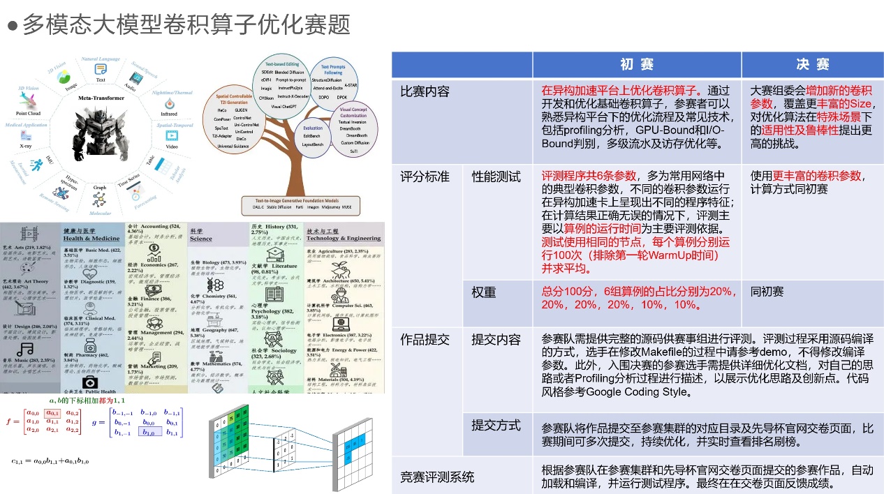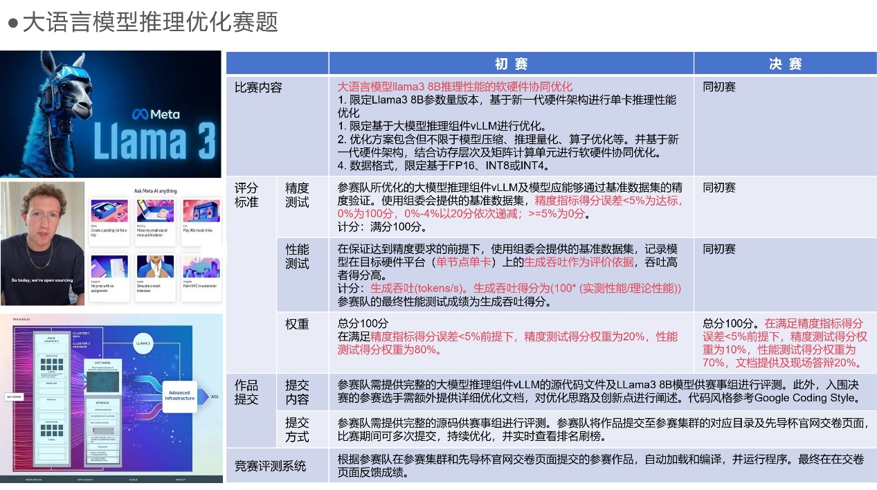 本届“先导杯”赛题聚焦于“大语言模型推理优化”和“多模态大模型卷积算子优化”两个方向,要求参赛者探索模型压缩、量化、算子优化等软件优化技术,并设计有效方案,实现在保证精度的同时,提升大模型推理性能。