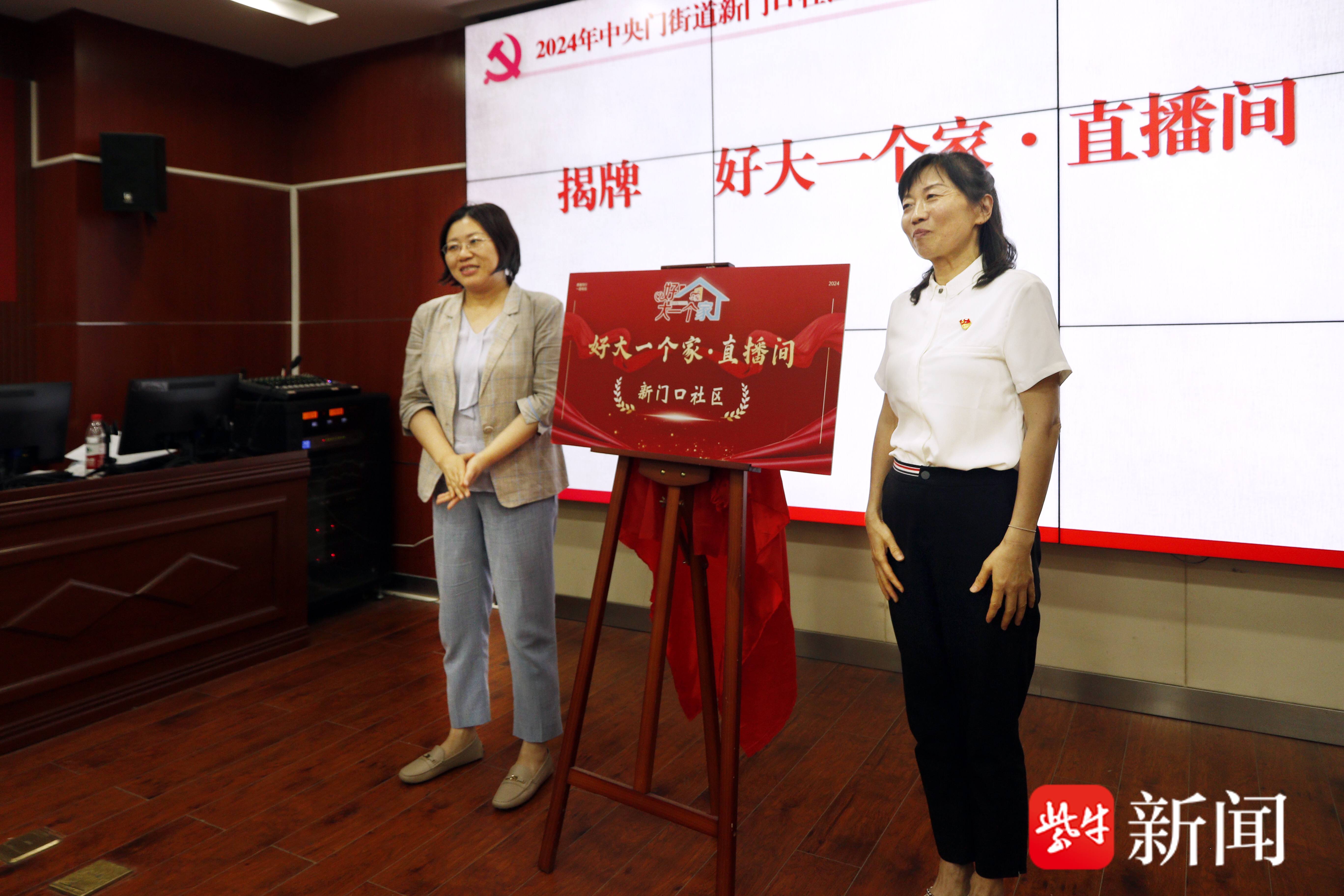 鼓楼区委常委、组织部部长时丹(左)、新门口社区书记王卫平为社区直播间揭牌