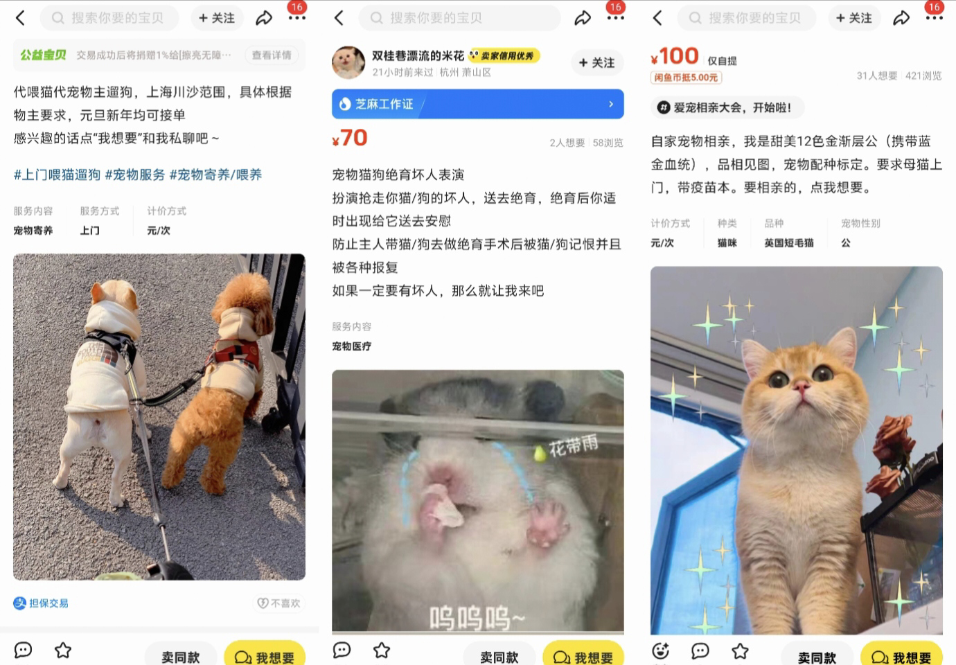 (图说:在闲鱼,代遛狗、宠物绝育坏人表演、宠物相亲等新型交易搜索量持续增高)