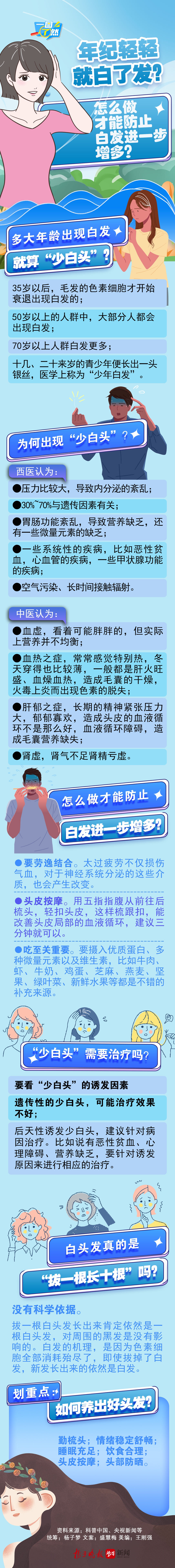 那么,究竟是什么原因让头发过早地变白了呢?这种让年轻人避之不及的白发,到底是如何形成的?“少白头”需要治疗吗?白头发真的是拔一根长十根吗?怎么做才能防止白发进一步增多呢?