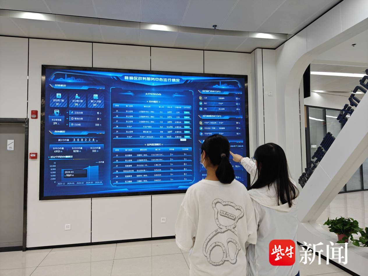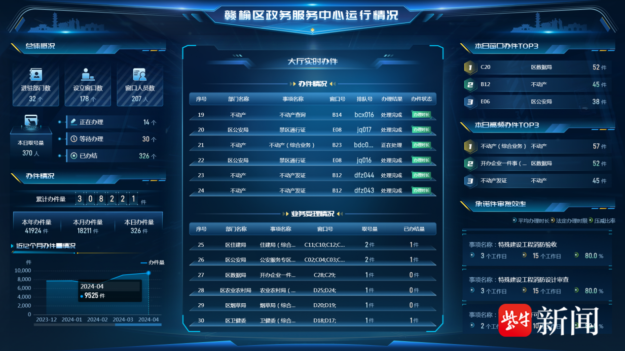 记者在区政务中心看到,政务服务数据可视化大屏就位于大厅二楼北侧中间位置,通过饼状图、柱状图、折线图、信息轮播等方式展示赣榆区政务大厅基本情况、事项办理情况以及政务大厅取(叫)号量、办件量、办理时间、等待时间以及承诺件审批效率等信息。该数据可视化大屏显示,各部门共52项高频承诺件办理时长较法定时限平均压缩79.5%。