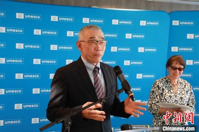 当地时间6月10日晚,位于巴黎的联合国教科文组织总部举办“国际茶日”系列活动。图为联合国教科文组织副总干事曲星致辞。孔帆 摄