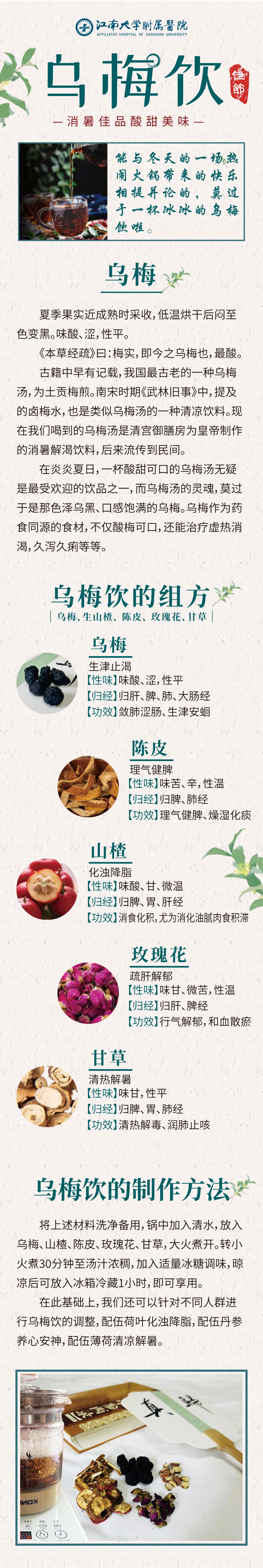 江南大学附属医院精心配制的乌梅饮组方,乌梅20g 、生山楂8g 、陈皮5g 、玫瑰花5g组成夏日特饮“乌梅汤”,煮开后转小火煮30分钟至汤汁浓稠,加入适量冰糖调味,晾凉后可放入冰箱冷藏口感更佳。在此基础上,医院中医科还针对不同人群进行乌梅饮的调整,如:配伍荷叶化浊降脂,配伍丹参养心安神,配伍薄荷清凉解暑等。值得注意的是,加入荷叶后有乌梅饮虽有通便之效,但可能会引起腹泻,需因人而异。