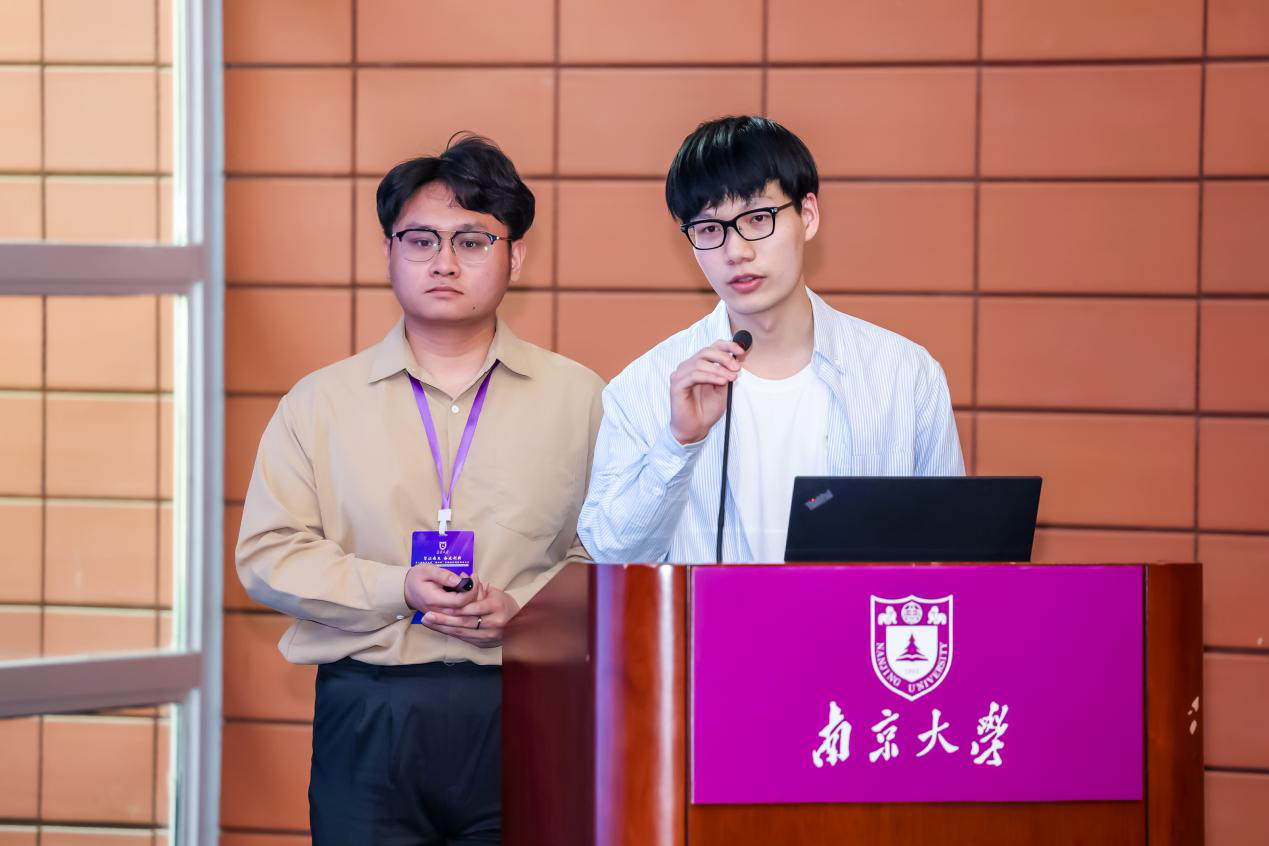 南京大学现代工学院研究生苏嘉伦和卿明凯在进行项目宣讲