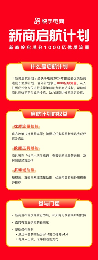 此前,在今年5月的2024快手电商引力大会上,快手电商副总裁、电商C端产品及中小商家业务负责人孔慧在主题演讲中宣布,未来快手电商将为新入驻的商家提供高达千亿的启航计划,配合扶摇计划流量一起帮助商家从首播冷启开始,快速扩大经营规模和GMV结果。