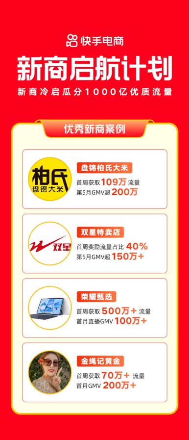 事实上,已经有不少商家从新商启航计划中受益。商家“盘锦柏氏大米”参与新商启航计划首周获得超百万流量,入驻快手第5个月的月GMV即超200万。商家“双星特卖店”参与新商启航计划首周平台奖励流量占比超40%,入驻快手第5个月的月GMV超150万。