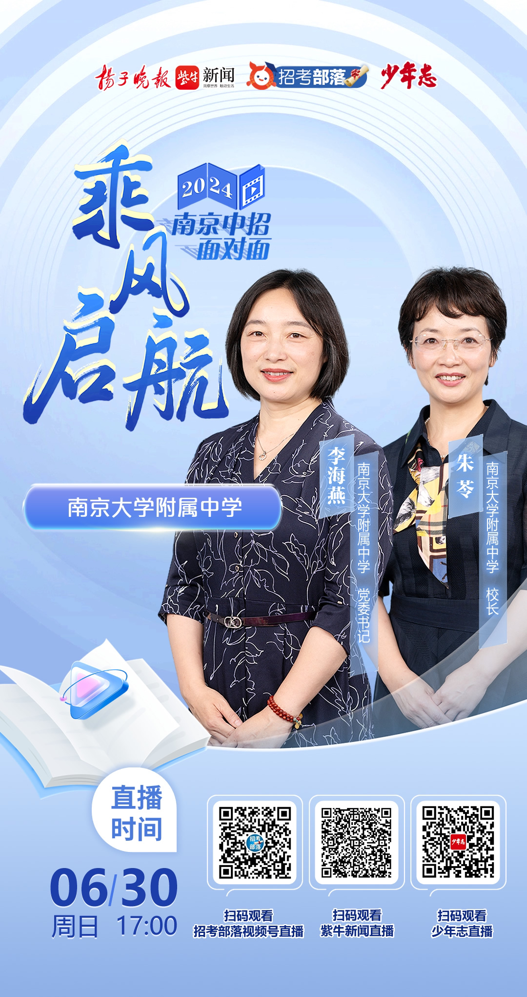 随着2024年南京中考成绩的揭晓,为了帮助广大考生和家长更好地了解学校情况,合理填报志愿。6月30日,扬子晚报特别推出“乘风启航·2024南京中招面对面”系列直播,本场我们特别邀请南京大学附属中学党委书记李海燕和校长朱苓走进直播间,为考生和家长填报志愿支招。