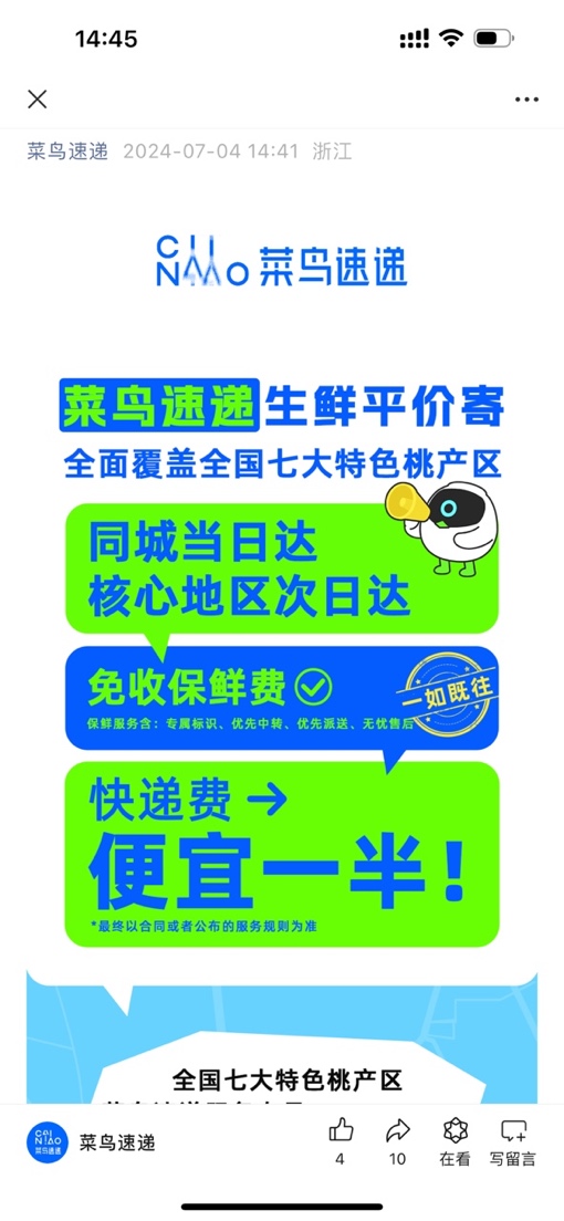 7月4日,菜鸟速递在公号发布的信息中,再次强调菜鸟速递提供保鲜服务,但一如既往地免收保鲜费。并宣称,生鲜平价寄服务进一步扩大,覆盖全国七大特色桃产区,提供同城当日达、核心区域次日达、送货上门等服务。免保鲜费后不少线路价格相较同类型快递便宜一半。