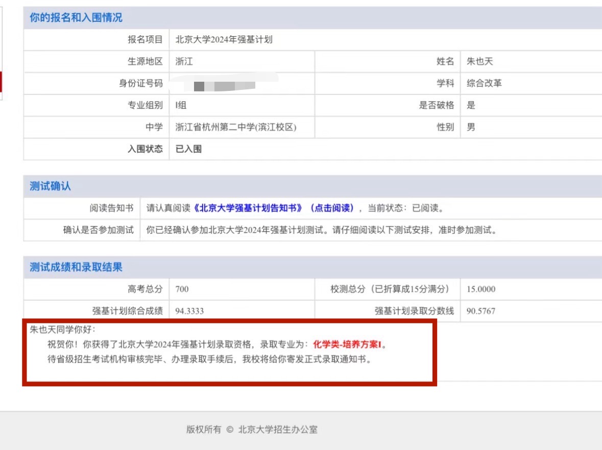 资料显示,朱也天获得北大2024强基计划录取资格,录取专业为化学类。待省级招生考试机构审核完毕,办理录取手续后,北大将寄发正式录取通知书。