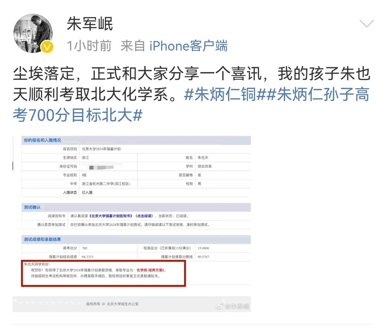 7月5日晚,父亲朱军岷通过视频分享了这一喜讯。当时正在直播的朱军岷通过手机获知消息,并于今日发文称,“终于尘埃落定了,正式和大家分享一个喜讯,我的孩子朱也天顺利考取北大化学系。”并表示感谢大家这么久以来的关注,网友纷纷表示祝贺。