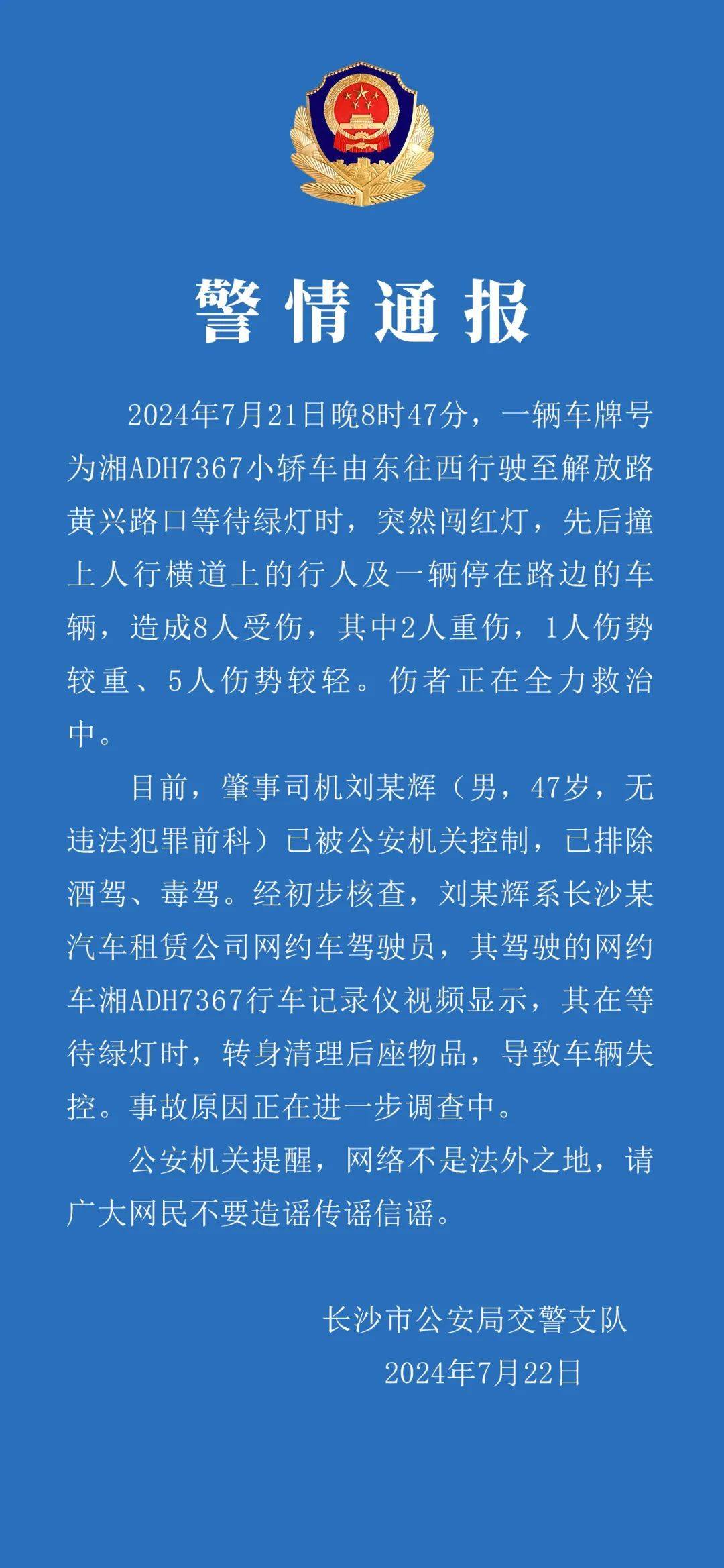 2024年7月21日晚8时47分,一辆车牌号为湘ADH7367小轿车由东往西行驶至解放路黄兴路口等待绿灯时,突然闯红灯,先后撞上人行横道上的行人及一辆停在路边的车辆,造成8人受伤,其中2人重伤,1人伤势较重、5人伤势较轻。伤者正在全力救治中。