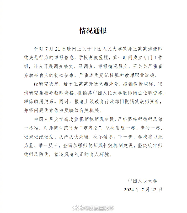 22日晚,中国人民大学发布情况通报称,针对7月21日晚网上关于中国人民大学教师王某某涉嫌师德失范行为的举报信息,学校高度重视,第一时间成立专门工作组,连夜开展调查核实。经调查,举报情况属实,王某某严重背弃教书育人的初心使命,严重违反党纪校规和教师职业道德。
