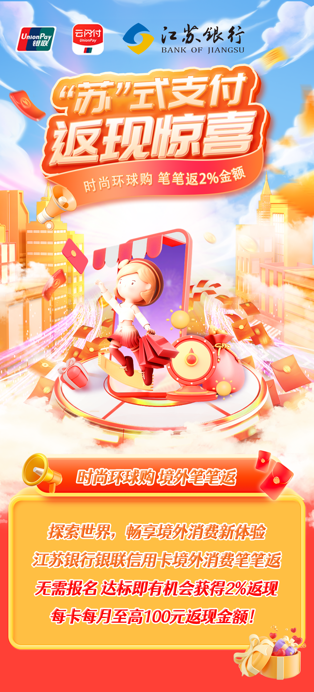 江苏银行银联信用卡境外线下消费,笔笔返2%!
