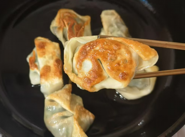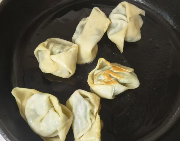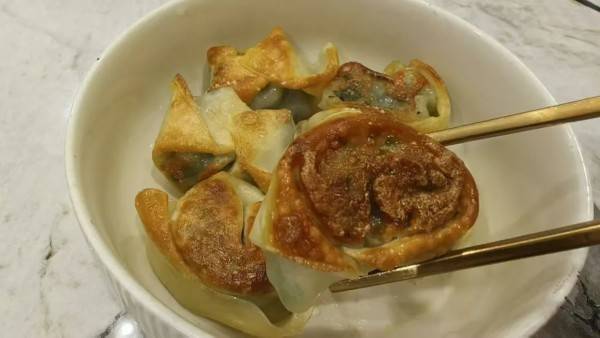 然后转动锅子,颠锅,翻面,让馄饨每一面都均匀受热,煎至颜色都是金黄,就可以出锅了。