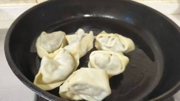 热锅冷油,油量铺平锅底即可。约5-6成油温下馄饨。煎2分钟后,将馄饨翻面,继续中火煎2分钟,到另一面也开始变得焦黄。